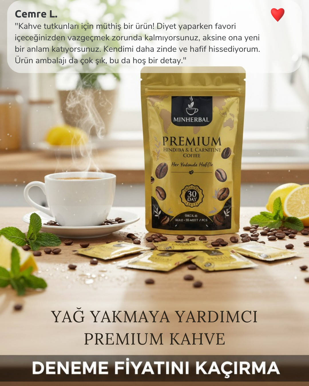 Minherbal Premium, kilo kontrolünü desteklemek ve metabolizmayı yenileyip düzenlemek için özel olarak geliştirilmiş bitkisel içerikli bir kahvedir. 30 adet tek kullanımlık saşe (3 gr) formunda sunulur ve toplam 90 gr’lık paketle 30 günlük kullanım için uygundur. Düzenli kullanımda 30 gün içerisinde ilk etkiler gözlemlenir; kalıcı ve net sonuçlar için 3-4 aylık kullanım önerilir.